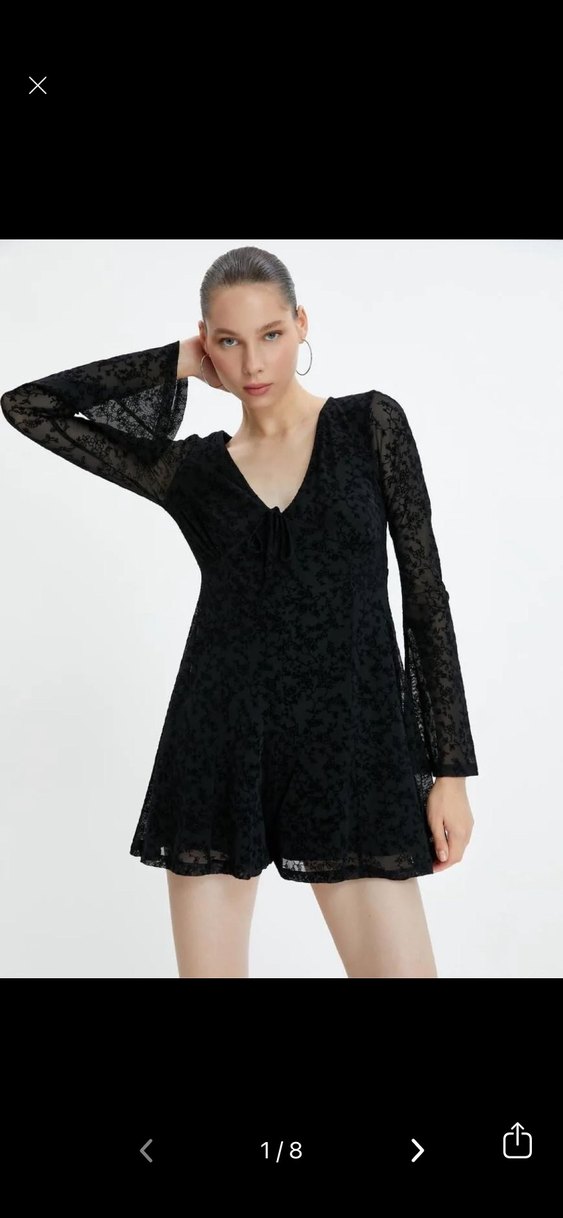Bir parti için almıştım fakat parti iptal oldu elbiseyi hiç giymedim tertemiz m-l için uygundur. Siyah mini elbise, uzun dantel kollu, V yakalı ve bol kesimdir. Yumuşak kumaştan yapılmıştır.