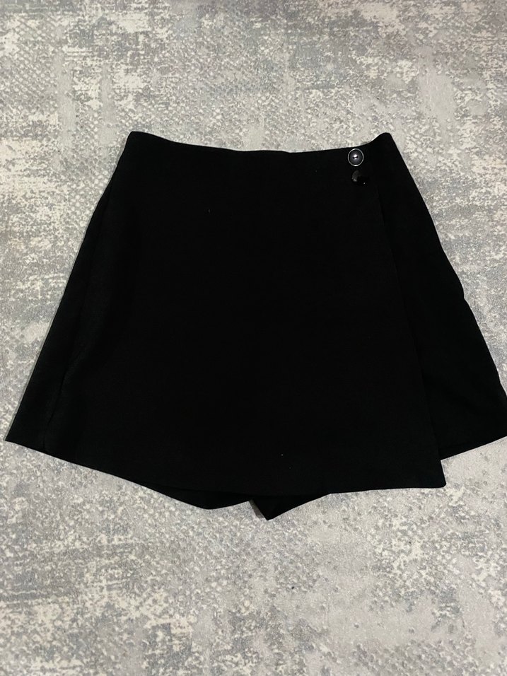 Siyah renkte, dantel detaylı, sentetik kumaştan yapılmış, bol kesim mini etek. Goth tarzına uygun, desensiz ve şık tasarım.