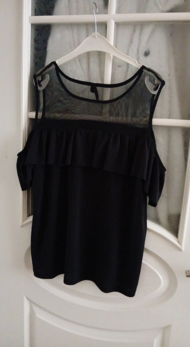 Siyah, dantel detaylı, omuzları açık ve fırfırlı midi uzunlukta, sentetik kumaştan yapılmış, bol kesim bir bluz.