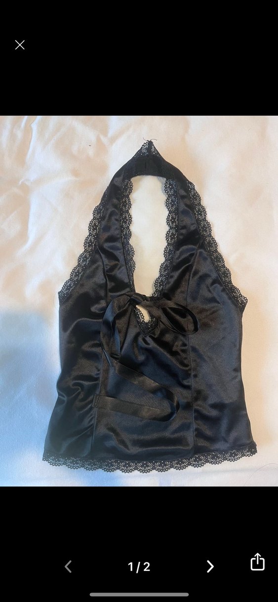 Siyah, dantelli ve saten dokulu, halter yaka ve ince askılı, göğse oturan midi uzunlukta bir kadın bustiyer.