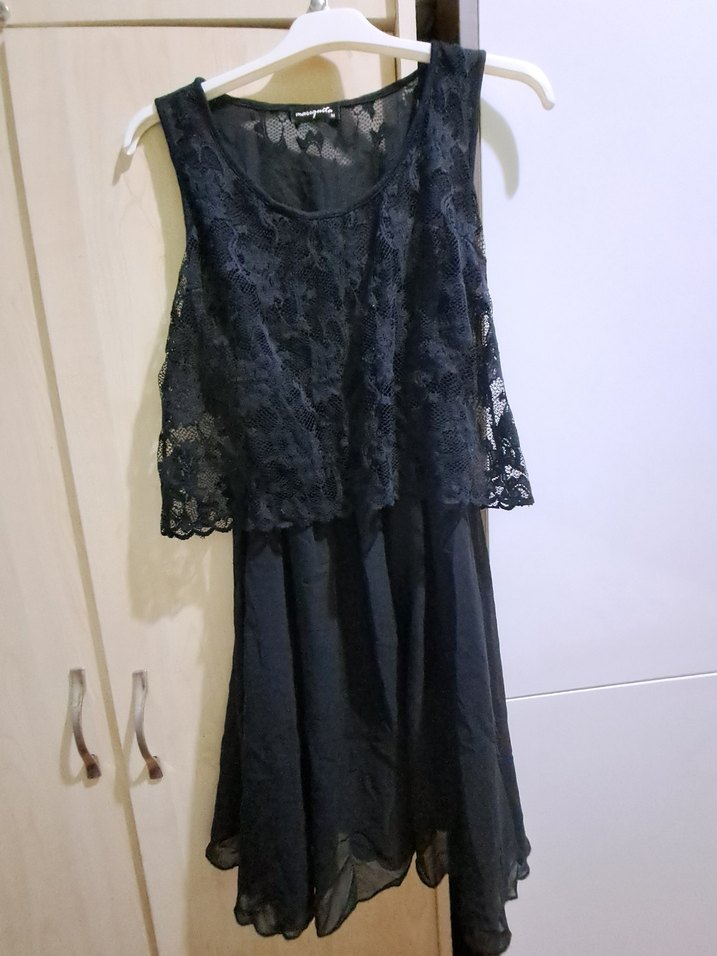 Siyah midi elbise, straplez yaka ve dantel detaylı, salaş kesim, romantik akşamlar için uygundur.