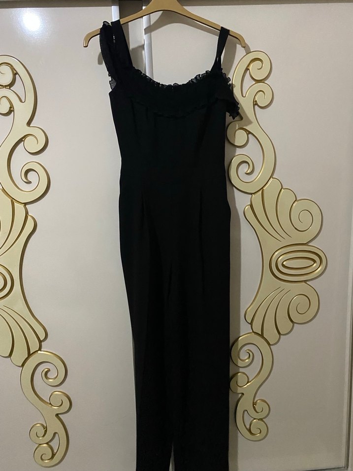 Siyah dantel detaylı, straplez, kolsuz, klasik şıklıkta uzun tulum. Yumuşak sentetik kumaştan, özel davetlere uygun.