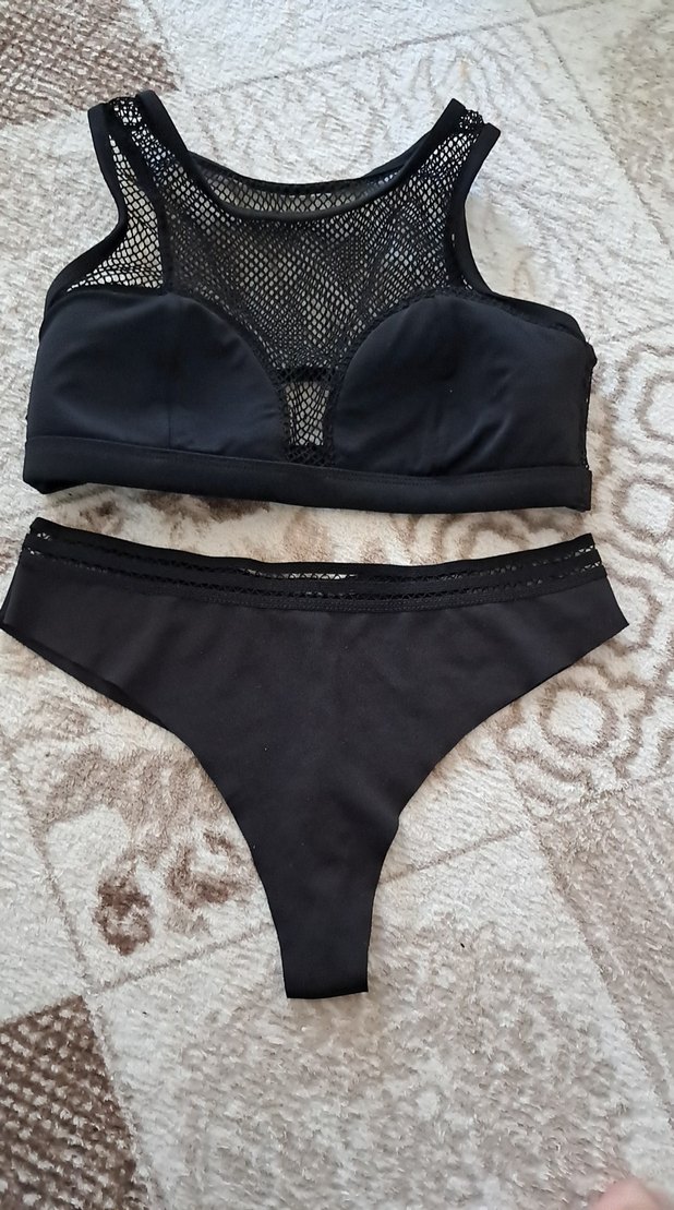 Siyah, dantelli ve strappy askılı, kısa kesim ve goth tarzı mini bikini, plajda kullanım için uygundur ️.