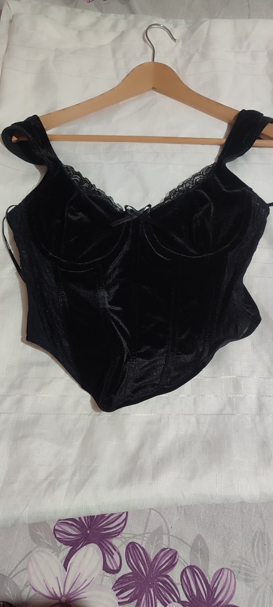 Siyah süet kumaştan, dantel detaylı V yakalı, askılı ve vücuda oturan gotik stil bustiyer. Romantik akşamlar için uygundur.