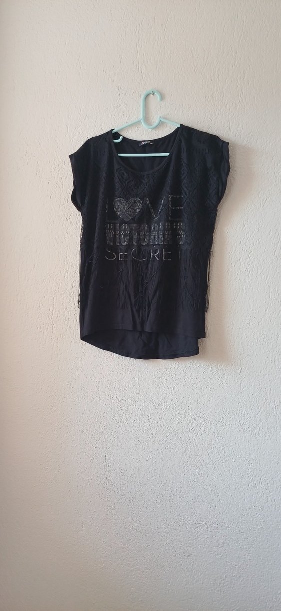 siyah tişört, kısa kollu ve yuvarlak yaka. Dantel detayları ve baskılı desen ile rahat ve şık bir tasarım sunar. S-M-L beden