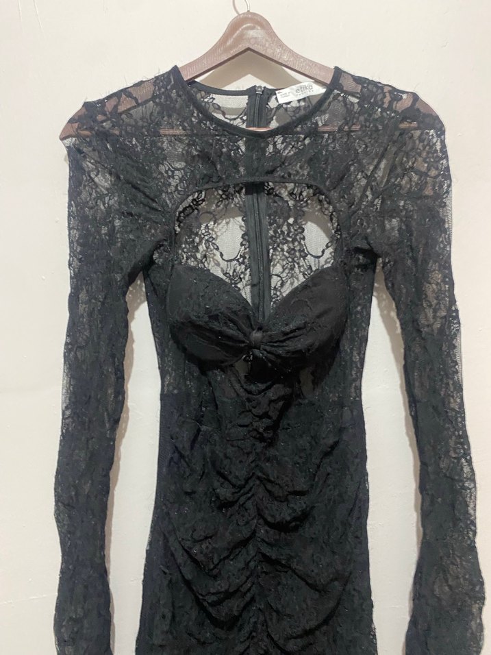 Siyah dantel detaylı, V yakalı ve askılı kollu, vücuda oturan uzun gotik elbise, romantik akşamlar için ideal. Desenli ve özgün tasarımlı.