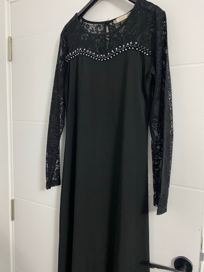 Siyah dantel kollu ve işlemeli detaylı, yüksek yakalı, uzun ve vücuda oturan gotik elbise.