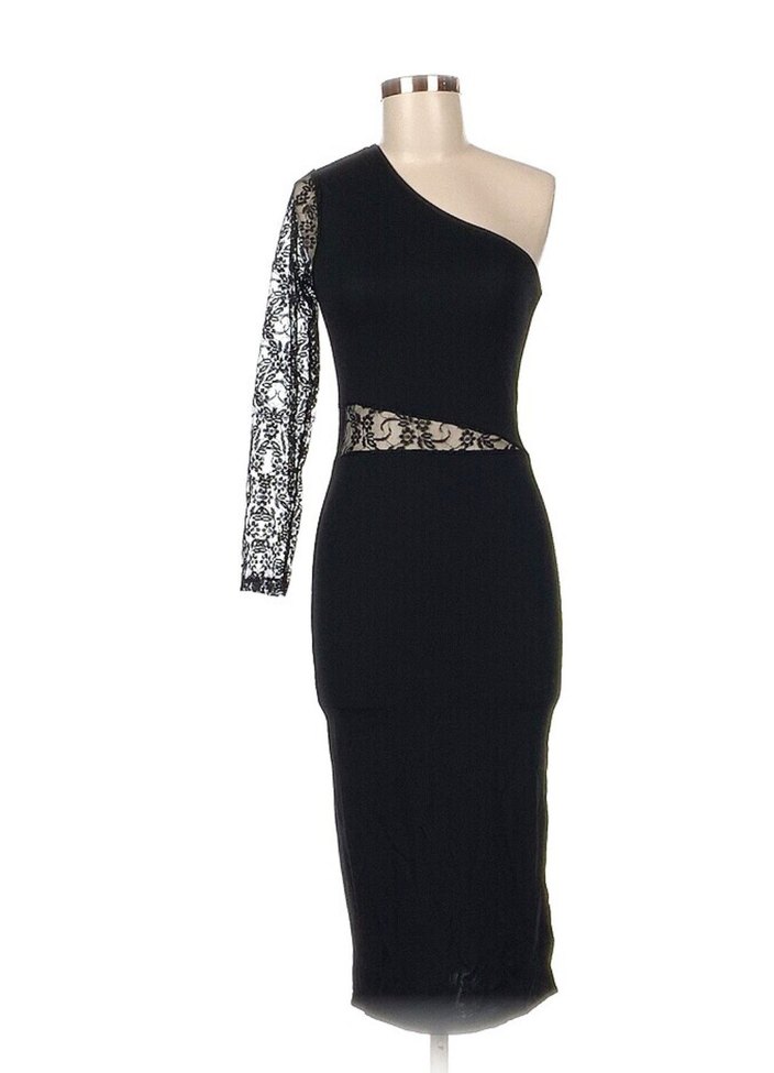Dantel detaylı, uzun ve vücuda oturan siyah abiye elbise, tekne yaka ve gotik tarzıyla romantik akşamlar için uygun.
