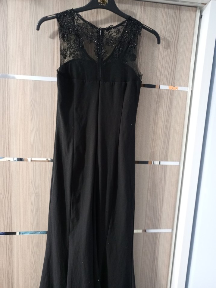 Siyah, dantel detaylı, V yaka ve kolsuz, drapeli uzun abiye elbise, düğünler için uygun.