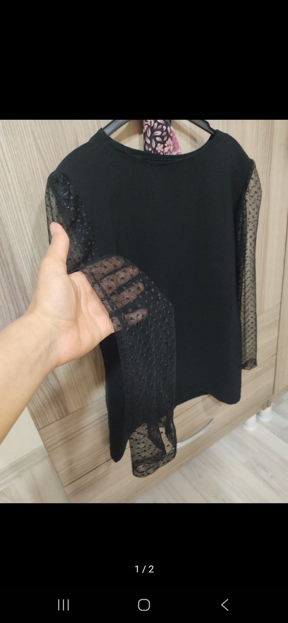 Dar kesim siyah bluz, uzun dantel kollu ve yuvarlak yakalıdır. Günlük kullanım için uygun gotik tarzda, kumaşı yumuşak ve hafif esnektir.