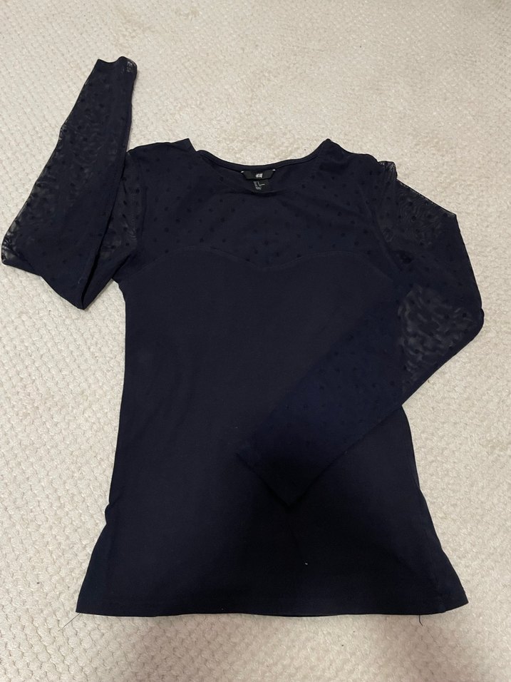 Dar kesim siyah bluz, uzun kollu ve yuvarlak yakalıdır, dantel detayları vardır Yumuşak sentetik kumaştan yapılmıştır, günlük kullanım için uygundur.