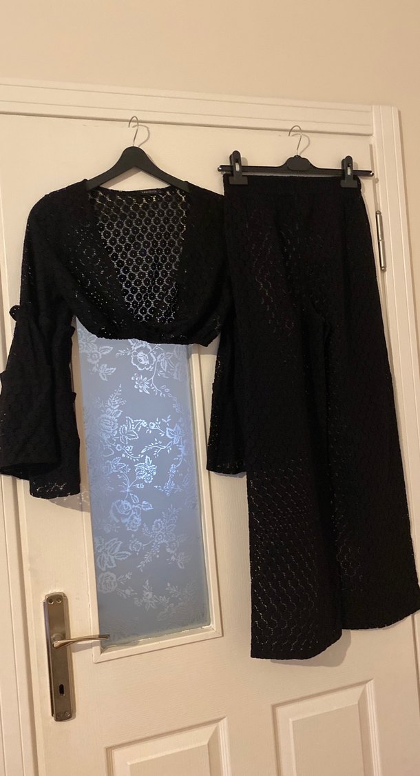 Kadınlar için dantel detaylı, uzun kollu, straplez yakalı, siyah triko kumaştan, bol kesim ve gotik tarzda takım. Ofis için uygundur.