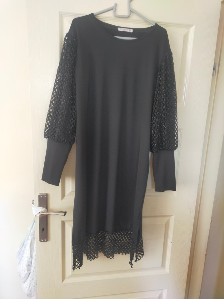 Siyah renkte, uzun kollu ve dantel detaylı, gevşek kesim uzun elbise. yuvarlak yakalı boyu uzun olanlar için tunik de olur