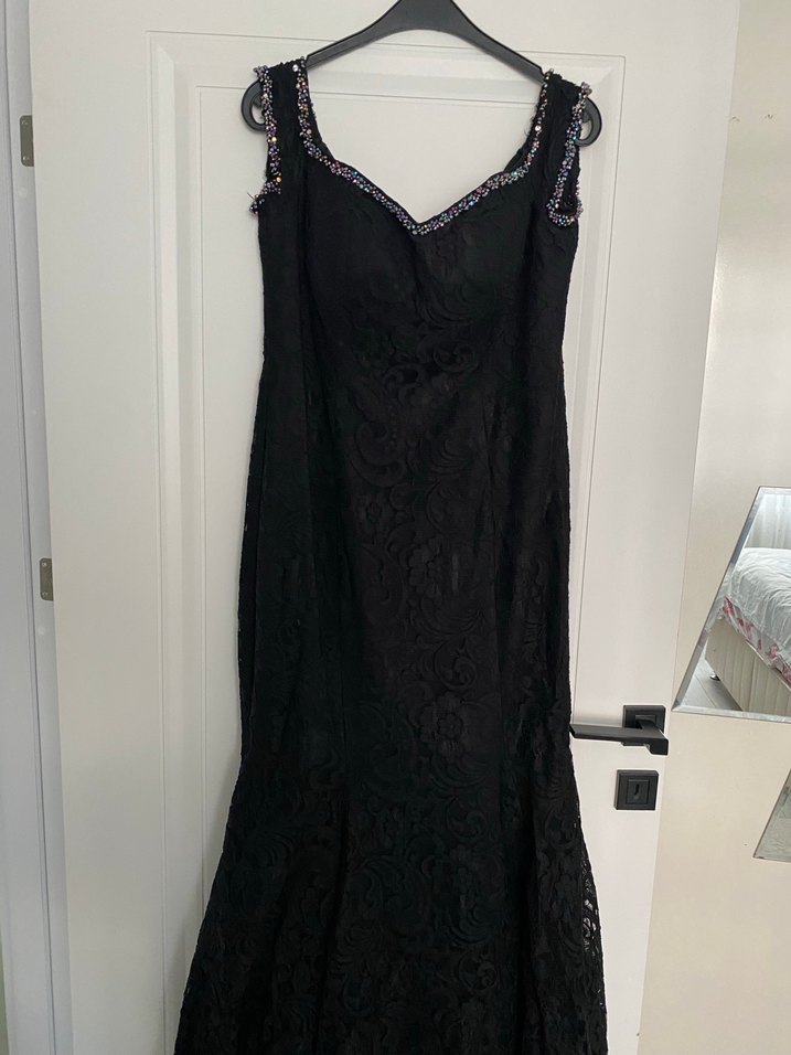 V yakalı, dantelli ve kolsuz siyah uzun elbise, gotik tarzda klasik bir şıklık sunar. Düğünler için uygundur.
