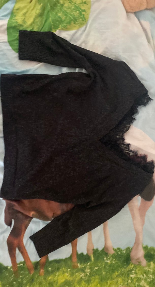 Siyah dantel detaylı V yaka, uzun kollu, midi boy, vücuda oturan kadın bluz. Yumuşak sentetik kumaştan, rahat ve şık goth tarzında.