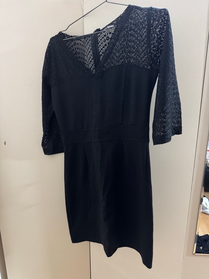 Siyah midi elbise, V yaka ve uzun dantel kollarla fit kesim sunar. Goth ve Parisian tarzını ofis şıklığıyla buluşturur.