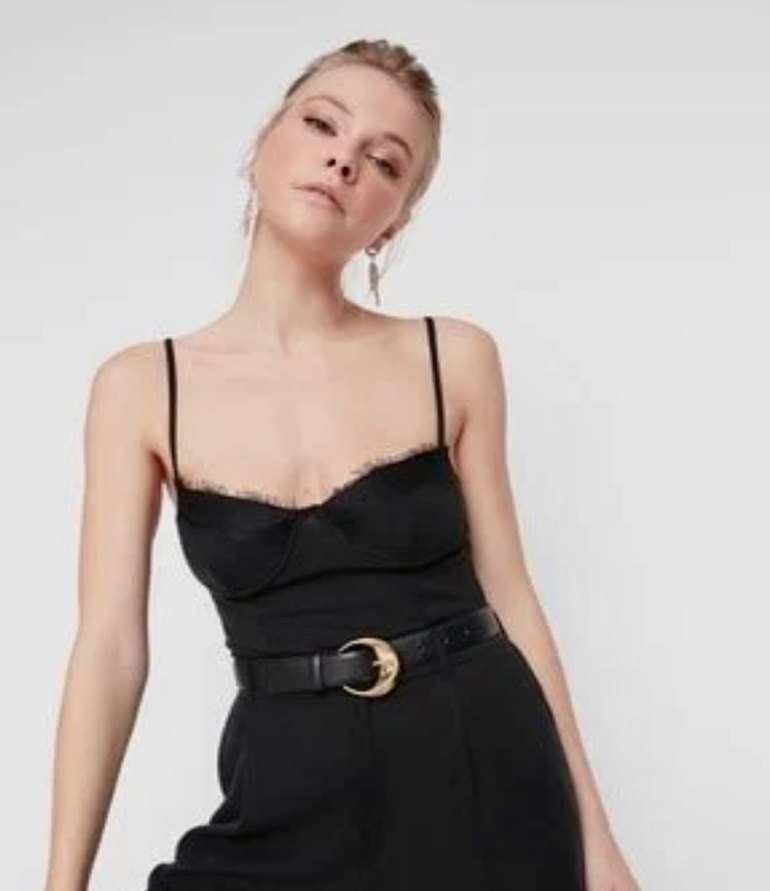 Siyah renkli, dantel detaylı, ve ince askılı, vücuda oturan gotik tarzda midi uzunlukta büstiyerdir. Yumuşak sentetik kumaştan üretilmiştir.