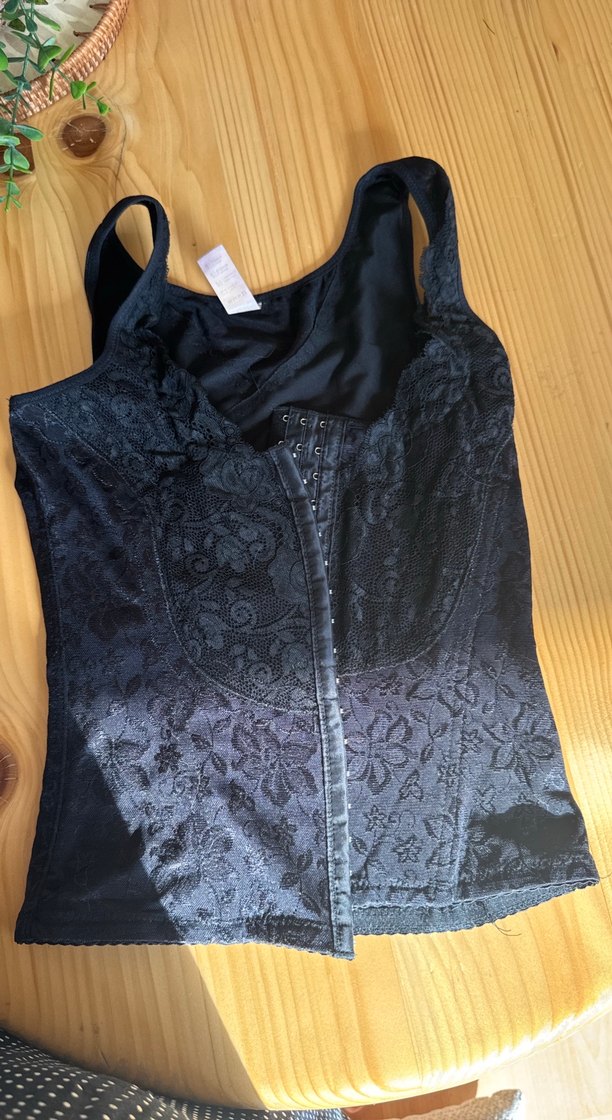 Siyah dantel detaylı, önü çıtçıtlı göğüs korsesi, midi boy ve vücuda oturan kesime sahiptir. Zayıflama bel inceltme için Anıl korse marka L beden