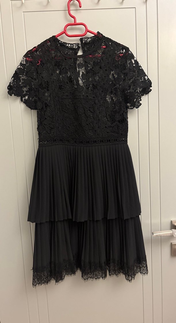 Yüksek yakalı, dantel detaylı ve fırfırlı katmanlara sahip siyah, oturan kesim midi elbise. Romantik akşamlar için uygundur.