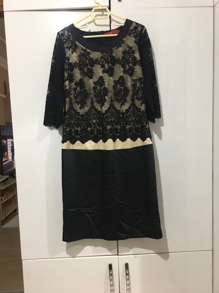 Dantel işlemeli, kısa kollu, tek parça siyah midi elbise. Tekstil kumaştan, klasik ve zarif tarzda, ofis için uygun butik ürünüdür.