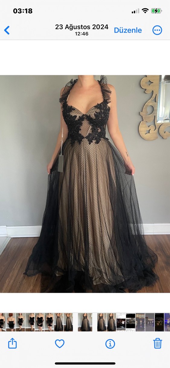 Siyah dantel ve işlemeli detaylara sahip, straplez yakalı ve uzun kollu olmayan bu dar kesim abiye, klasik gotik şıklık sunar. Düğünler için ideal, koyu renkli katmanlı tasarım.