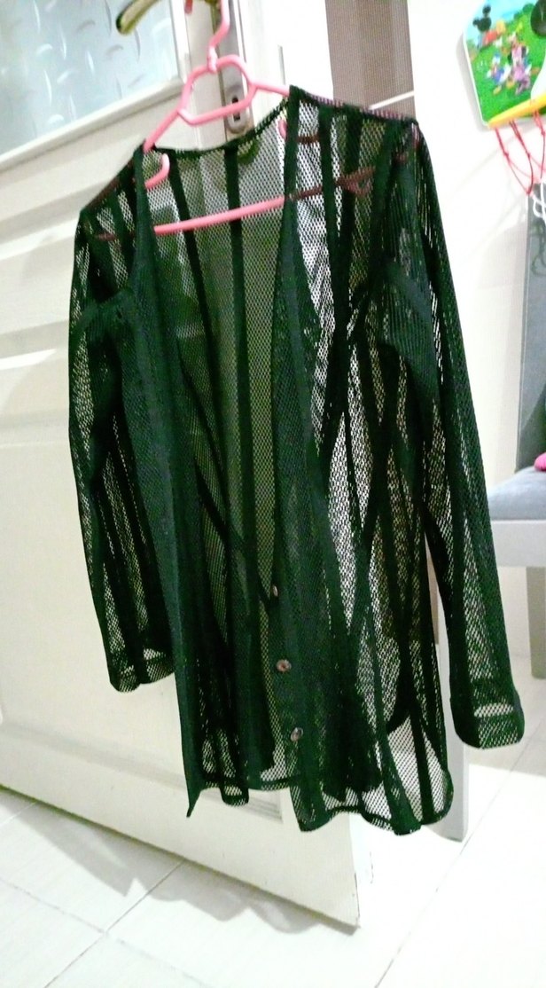 Siyah dantel detaylı, askılı kollu midi boy hırka. Sivri yaka ve bol kesim özellikleriyle, yumuşak sentetik kumaştan üretilmiştir.