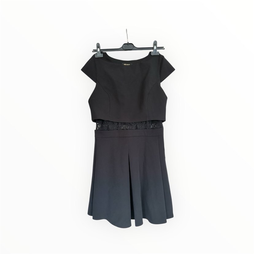Siyah, mini elbise, dantel kemer detayına sahip, ofis için şık ve rahat bir tercih.