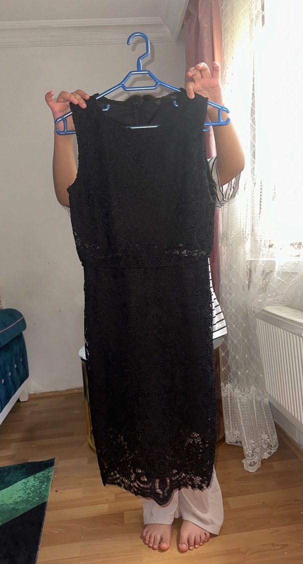 Kolsuz, dantel detaylı siyah midi elbise, vücuda oturan kesimiyle gotik tarzda şık bir görünüm sunar. Straplez yakaya sahiptir.
