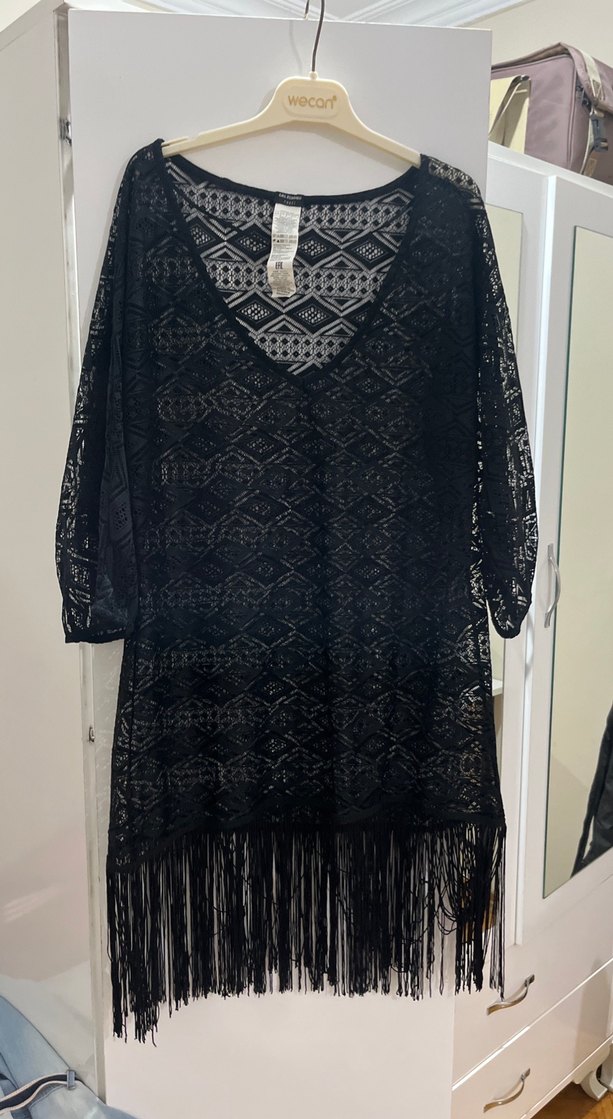 Siyah renkli, V yaka, uzun kollu, bol kesim örme tunik. Nakışlı dantel detayları ve püsküllü etek ucu bulunur. Bohem tarz için uygundur.