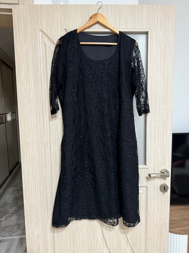 Siyah midi uzunlukta, gevşek kesim, kısa dantelli kollara ve yuvarlak yakaya sahip klasik gotik şıklığında ofis elbisesi.