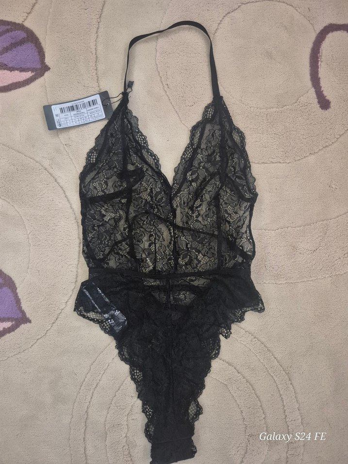 Siyah dantelden midi uzunlukta, gotik tarzda kadın iç giyim. İnce dantel kumaş ve boyundan bağlamalı tasarıma sahiptir.