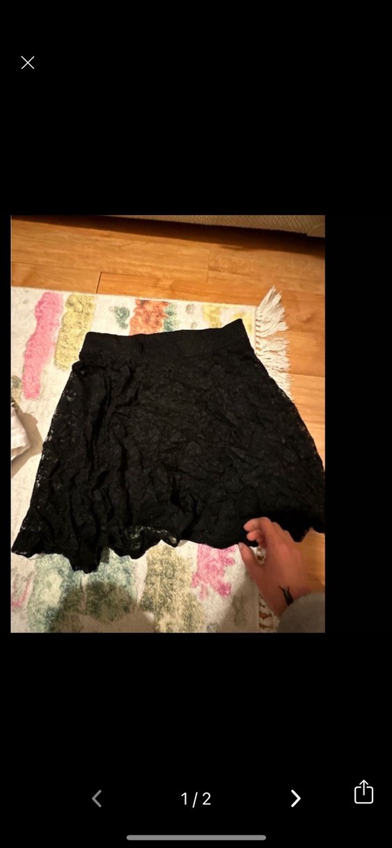 Siyah dantel detaylı, sentetik kumaştan yapılmış, vücuda oturan mini etek. Gotik, bohem veya retro tarzlar için uygundur, romantik akşamlar için ideal.