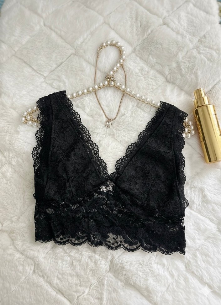 Siyah dantel malzemeden yapılmış, kısa kesim ve V yaka tasarımlı mini goth bralet. Paris tarzına uygun şık bir parça.