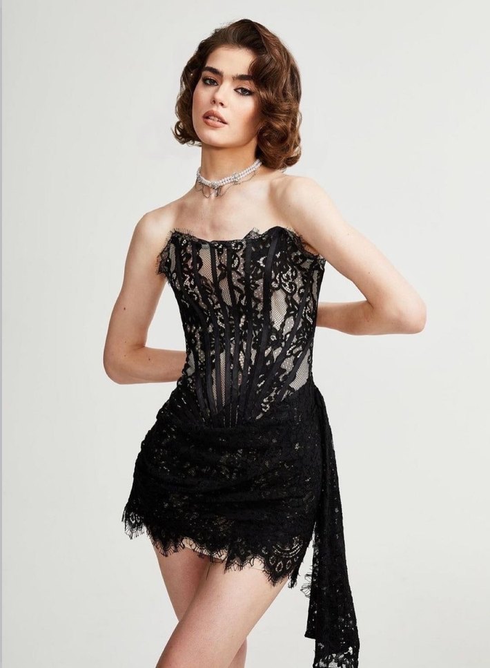 Siyah dantel kumaştan, straplez ve askılı detaylara sahip, vücuda oturan uzun abiye elbise. Gotik tarzıyla romantik akşamlar için uygun.