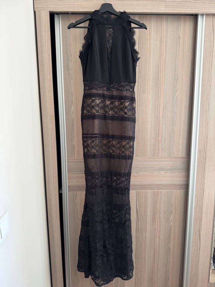 Sadece 1 kez kullanıldı. 34(XS) beden. Siyah, dantel detaylı, ince askılı uzun, vücuda oturan gotik tarzda abiye elbise.