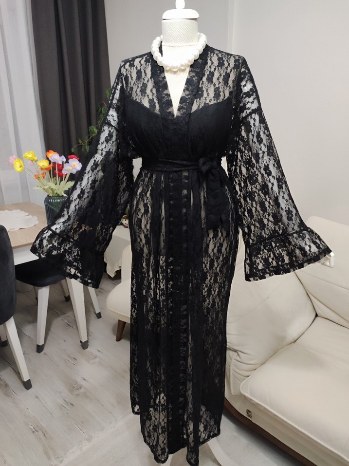 Siyah, uzun kollu ve bol kesim bu kadın giydirme elbise, detaylı dantel deseni ve bel bağcığı ile gotik tarzda şık bir görünüm sunar.