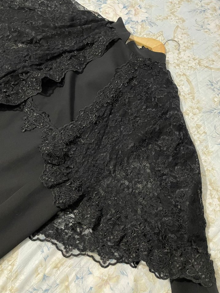 Siyah renkli, uzun kollu ve bol kesim gotik tarzda işlemeli dantel detaylı abiye elbise. Straplez yakalı ve uzun boydur, düğünler için uygundur.