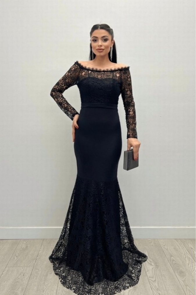 Siyah dantel uzun kollu, balık kesim kalıpta, kayık yaka detaylı abiye elbise. Romantik akşamlar için uygun.