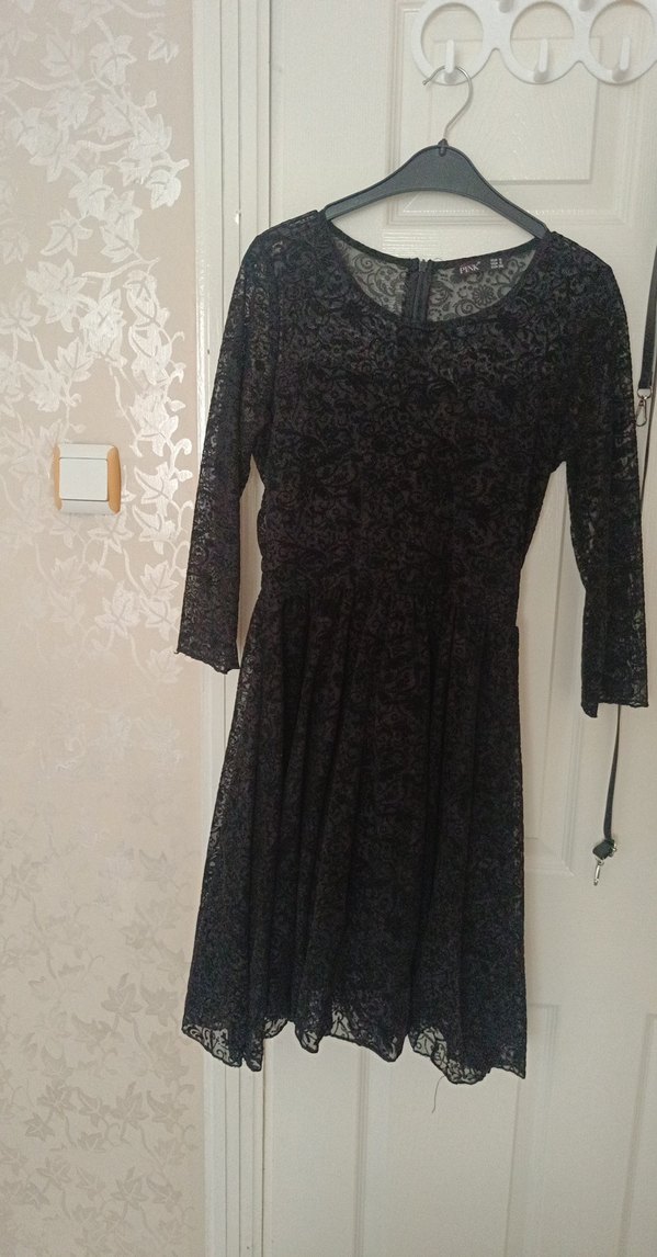 Siyah dantel kumaştan, uzun kollu, bol kesim gotik abiye elbise. V yakalı ve diz üstü belden kavramalı ve astarlı çok şık
