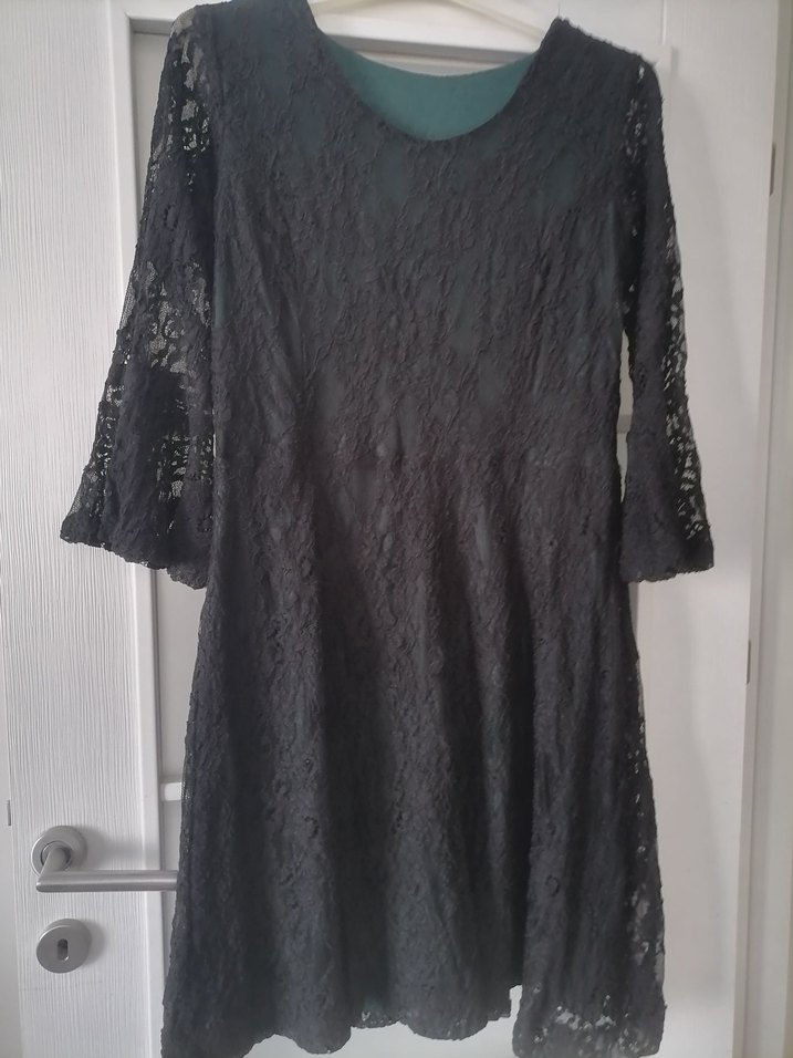 Siyah dantel detaylı, uzun kollu ve bol kesim midi elbise, romantik akşamlar için goth ve bohem tarzını yansıtıyor.