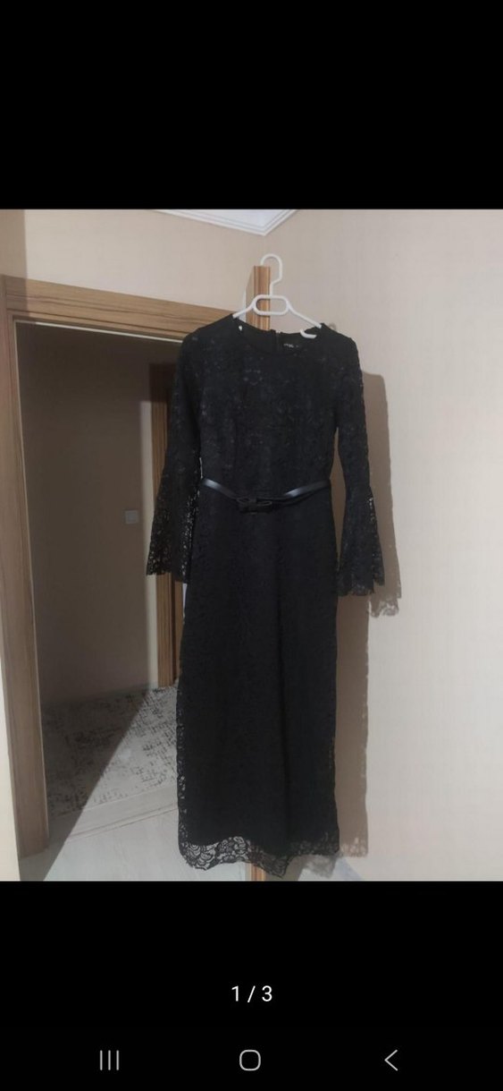 Uzun kollu, kemerli siyah dantel elbise,
