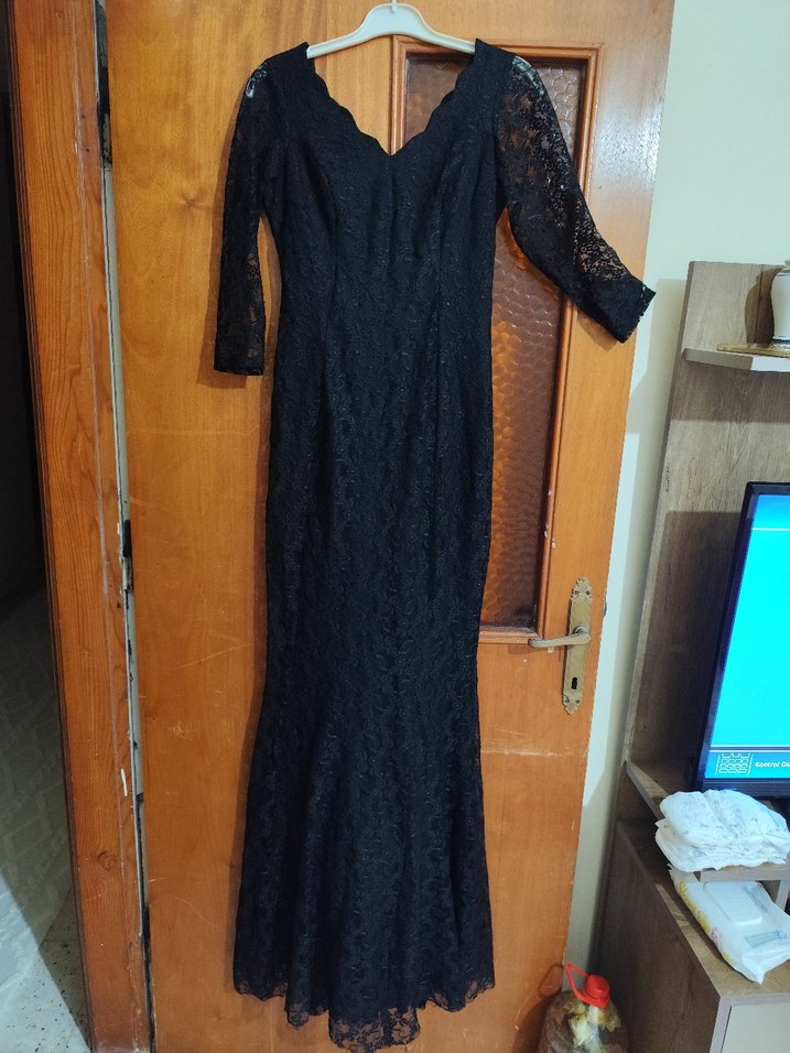 Siyah dantel kumaş, uzun kollu ve V yakalı, klasik şıklıkta gotik tarzda uzun, dar kesim abiye elbisedir.