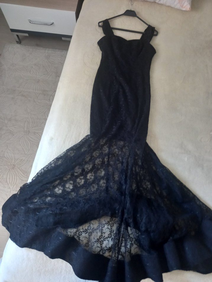 Siyah dantel detaylı, straplez ve uzun etekli bu dar kesim elbise, gotik tarzı ve düğünler için uygundur. tüm boy aşkı ile beraber 150 cm bel co cm .90 cm yere kadar kumaşı var içinde gerisi tül. göğüs 44 cm.arkadan gizli fermuarlı