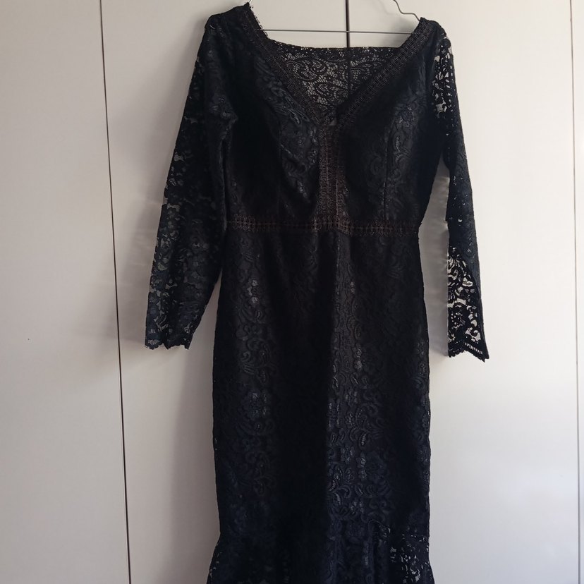 V yaka ve ince askılı uzun siyah elbise, detaylı dantel kumaşla klasik gotik şıklık sunar. Romantik akşamlar için uygun.