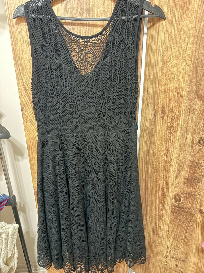 Dantel detaylı, V yakalı ve kolsuz siyah midi elbise, romantik akşamlar için ideal.