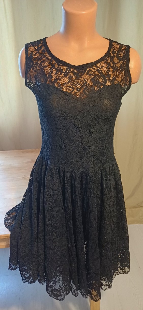 Siyah dantel kumaştan, V yakalı ve kolsuz, midi uzunlukta, vücuda oturan gotik elbise. Romantik gece için ideal.