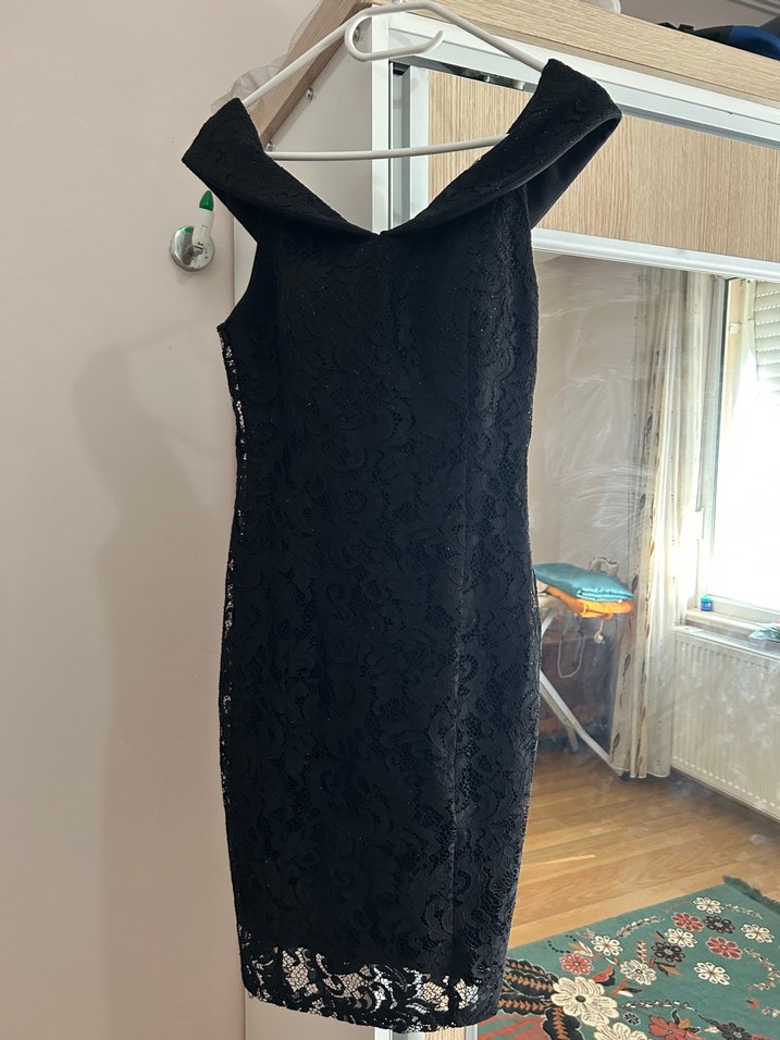 Siyah dantel kumaştan, V yakalı ve kolsuz, dar kesim midi boy gothic tarzda kadın abiye elbise, romantik akşamlar için uygundur. 36 38 beden için uygundur