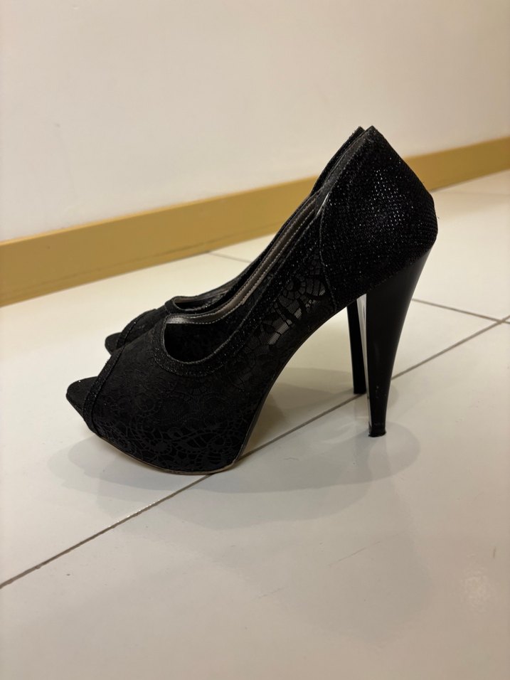 Siyah renkte, dantel detaylı ince topuklu kadın ayakkabısı. topuk boyu 12 cm