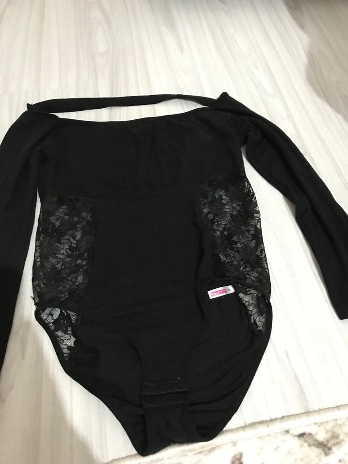 Siyah, yanları dantelli, uzun kollu ve vücuda oturan emzirme korsesi. Midi boyu ile normal uzunlukta ve şık bir görünüm sunar.