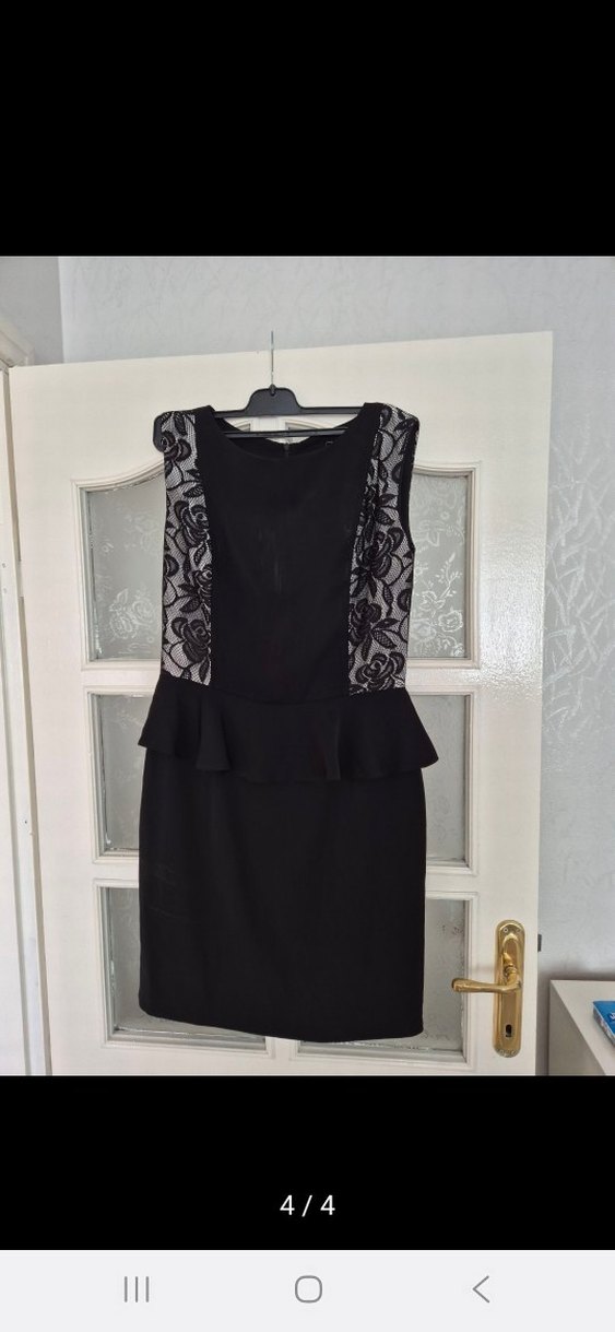 Kolsuz, dantelli yan detaylı ve belde fırfırlı siyah elbise, vücuda oturan kesime ve baskılı desene sahip. Şık etkinlikler için uygun. Ürün tam kalıptır. 40 bedendir.